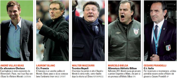 Latch Not to forget that Claudio Ranieri still has another year in his contract (and if he made a miracle in the league...), over his shoulders, there have always been two favorites. Andre Villas Boas, just sacked by Abramovich, would be available immediately. But on his name, there are arguments against him. The flop at Chelsea and his clashes with the old guard (Lampard, Essien, Cole) do not play to his favor. And everyone knows that Mourinho has not taken the side of his young Portuguese colleague with whom, Mou has not gotten along with for some time. And to think that the British bookmakers quote his passage to Inter at 1.90, a significant advantage over rivals. The closest is Laurent Blanc (at 5.0), and Moratti also admires his old favorite. But the French coach on the eve of the Euro, is in a delicate situation with his federation. There is the risk that they will force him to wait until the end of the continental competition to decide on his future. And Inter are oriented to make a decision as soon as possible. Another candidate is Cesare Prandelli: he is liked at Inter thanks to his willingness to work with younger players and that is probably the most important aspect that the club must work on for the future. But right now, it is just a thought. Before we go any further, the club should check at all levels in order to avoid problems with all federations.