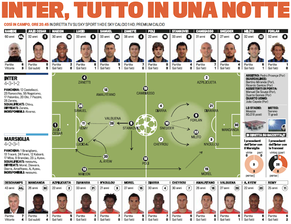 Pedestal of a cycle Ranieri will also field Forlan alongside Milito who is also looking to return to form especially in Europe. Just like Sneijder who has not scored since October 26 as Cambiasso and the same as Forlan who missed the group stage and now he wants space, goals and especially failing at Marseille after 10 minutes. In short, tonight should be the night to see the true Inter. There are 30 accredited French journalists, and all were next to Remy and to his brother Ayew. One spot to become the top eight teams in Europe is on the line but that's not all. For Olympique Marseille, its bench and prestige are on the line while for Inter, the passage to the next round is a pedestal of a cycle: for seven seasons, the Nerazzurri have won at least one trophy a season for a total of 15. If they go out tonight, the cycle will be closed because Scudetto and Coppa Italia are impossible.