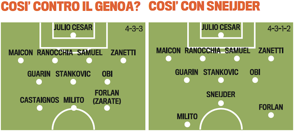 Tactics Starting today, Stramaccioni will begin the process to find the team against Genoa. There is the hypothesis of a 4-3-3 but when Sneijder returns, he could use the diamond midfield or the Christmas tree formation. Also watch out for the 4-2-3-1 of Mourinho and three main ideas. First, he does not like the 4-4-2. Second, he wants a director who knows how to set things up and move in to free space and Stankovic seems to fit that characteristics. Third, Zarate and Castaignos are likely to be relaunched by the new coach. Milito, right now is more likely to start than Pazzini and the team is again waiting for the return of Wes who will have a free role when he comes back.